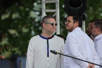 Está acompañado por varios miembros de su gabinete, incluidos los ministros de educación, cultura y juventud, justicia y paz y transporte.
