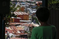 Muestra a un niño que enfrenta la incertidumbre del futuro, un reflejo de la difícil realidad de que más de 170 familias desalojadas en un período de diez días en Guadalupe (Cartago) y Tirrases (Curridabat) debido a los riesgos ambientales el año pasado.